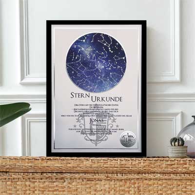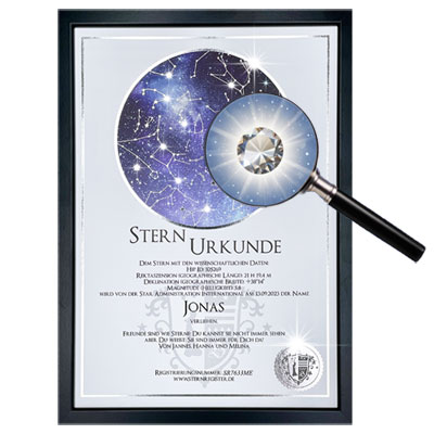 Die Sternurkunde ist das Herzstück der Sterntaufe: Sie dokumentiert ihren persönlichen Eintrag in das internationale S.A.I.-Sternregister®. Neben dem von Ihnen gewählten Sternnamen und dem Taufdatum sind auch die wissenschaftlichen Daten und Koordinaten Ihres Sterns auf der Urkunde angegeben. Optional können Sie Ihrer Sternurkunde auch eine persönliche Widmung hinzufügen – natürlich kostenlos.