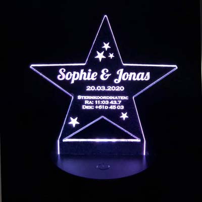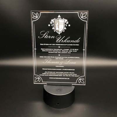 Der von Ihnen gewählte Sternname, das Taufdatum und die Koordinaten Ihres Sterns werden für sie in den Stern eingraviert. Die Beleuchtung erfolgt über den mitgelieferten LED-Leuchtsockel.Die Beleuchtung des Sterns ist in 7 Farben möglich: Weiß, blau, lila, hellblau, rot, grün, gelb. Die Farbeinstellung kann entweder direkt über den Sockel oder über die beiliegende Fernbedienung vorgenommen werden.